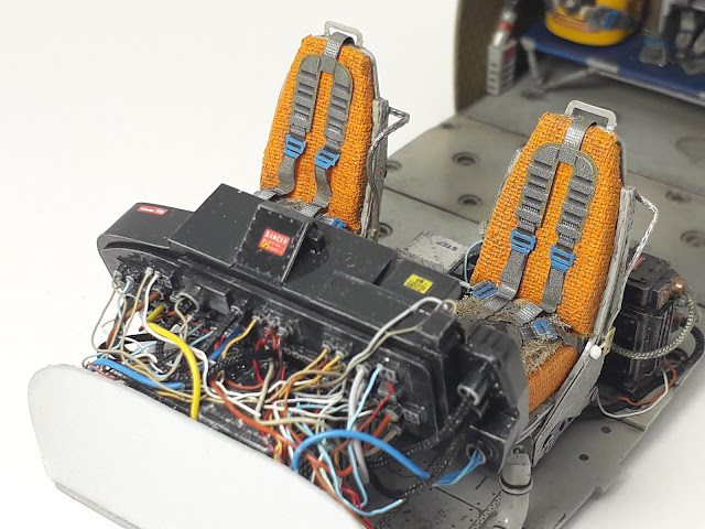 I cuscini sui sedili di pilota e osservatore sono stati ottenuti utilizzando materiale da flocking incollato con colla vinilica diluita ad acqua su una base sagomata di plasticard (in pratica sono peletti sintetici utilizzati nel modellismo civile per ricreare moquette o tappetini di auto).